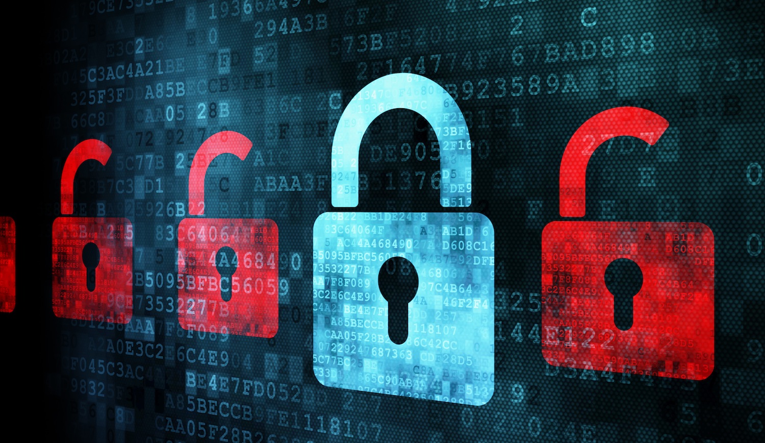 Many red opened locks around one closed blue lock